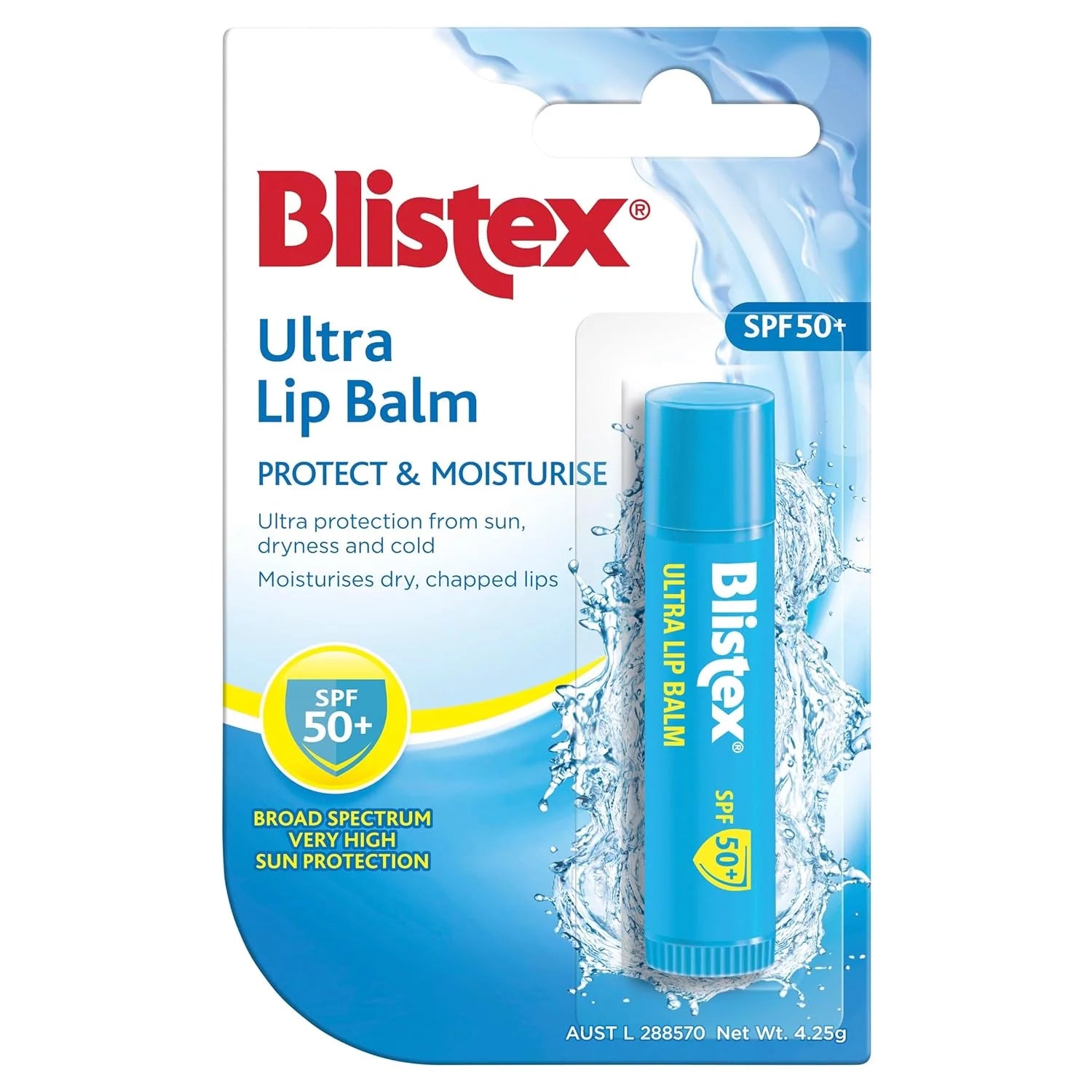 The Blistex Ultra Lip Balm SPF50+ protects, moisturises and keeps lips smooth. The broad spectrum sunscreen gives you 100% protection from the sun's harmful rays. Blistex Ultra Lip Balm SPF50+ makes your lips soft and moisturised and the very high protection SPF50+ means you can enjoy the outdoors in comfort, knowing you're protected from the harmful rays of the sun.
