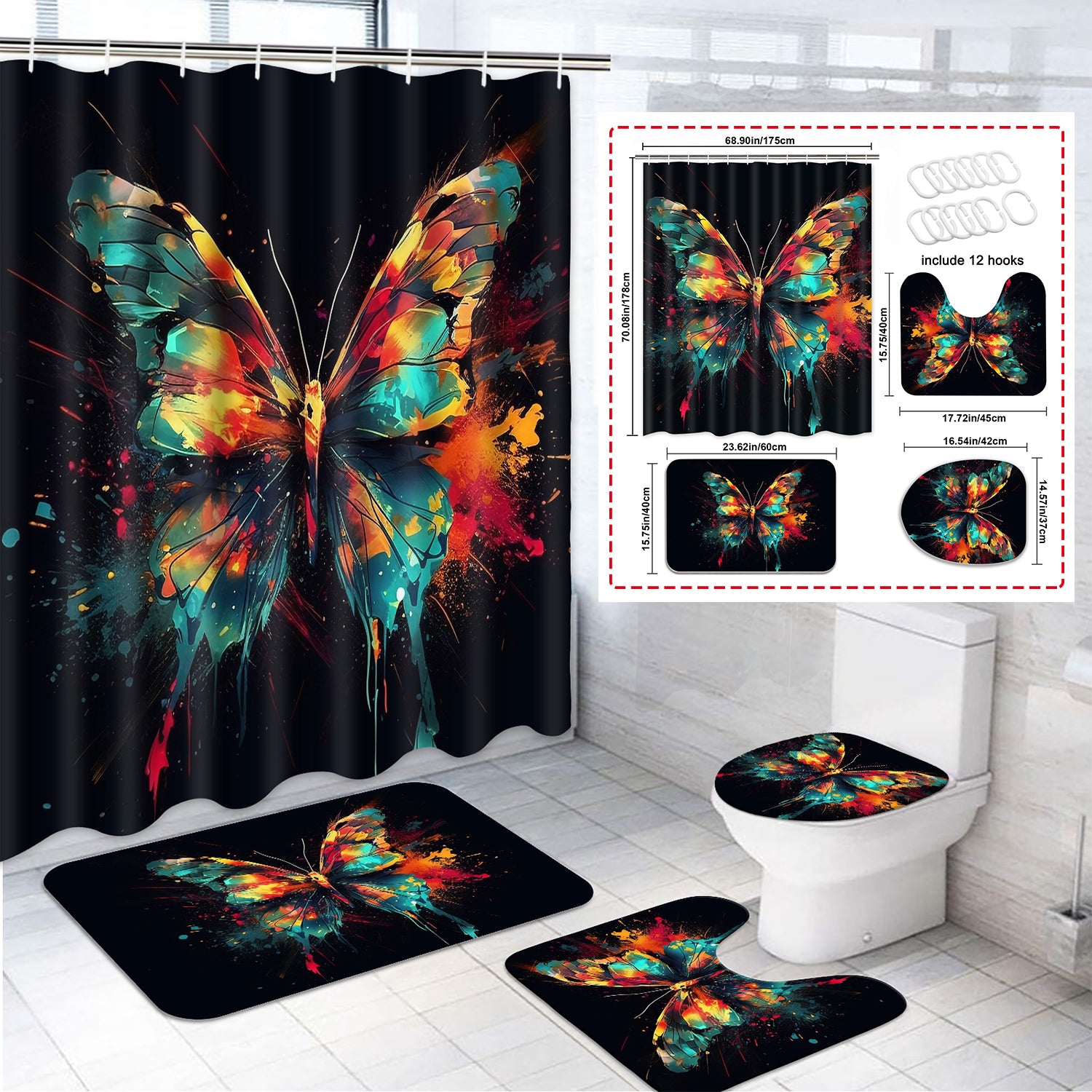 Futtumy 4 Pcs Bathroom Shower Curtain Sets, Polyester Shower Curtain Sets with Bath Rugs, Colored Single Butterfly Painted Pattern Bathroom Sets with Shower Curtain and Rug Set