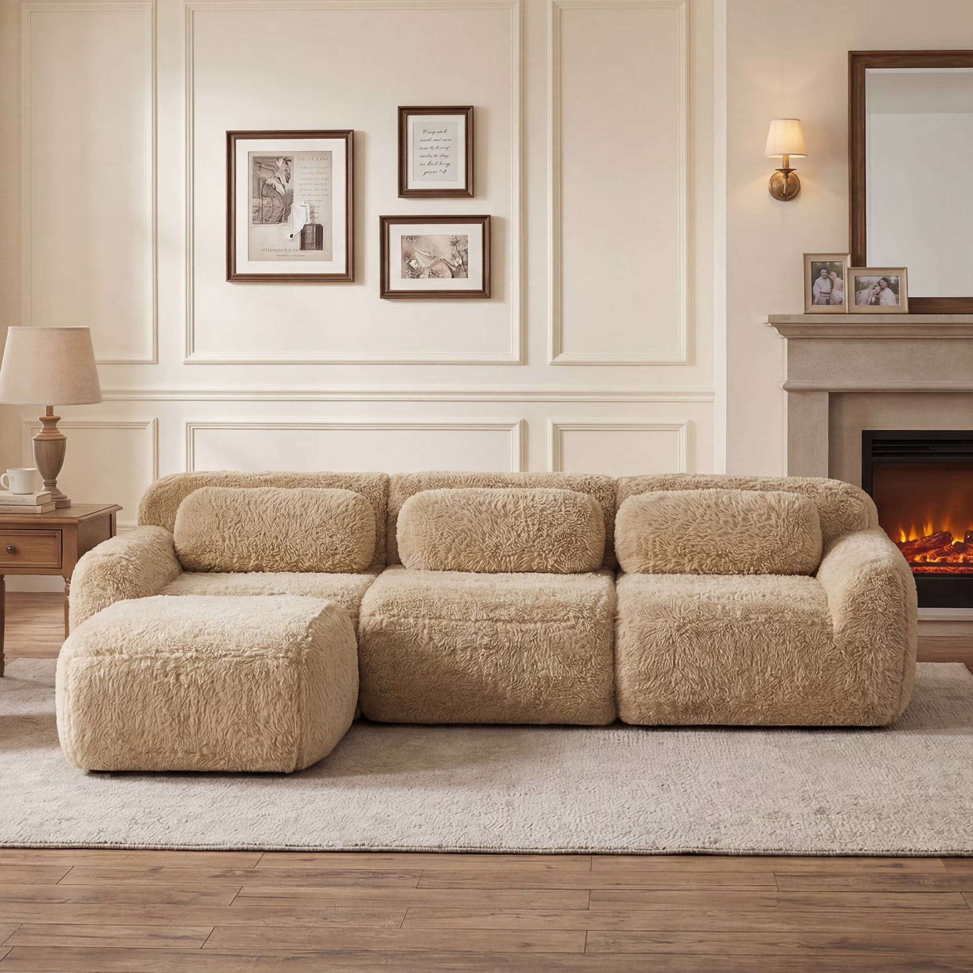 L-shaped Soft and Fluffy Plush Fabric "Boneless" Sofa with Throw Pillows | 32D High-Density Sponge Filling | No Assembly Required | Non-Slip Base Design | Buckle Connection | Movable Ottoman | Ideal for Study/Lounge | Light Khaki