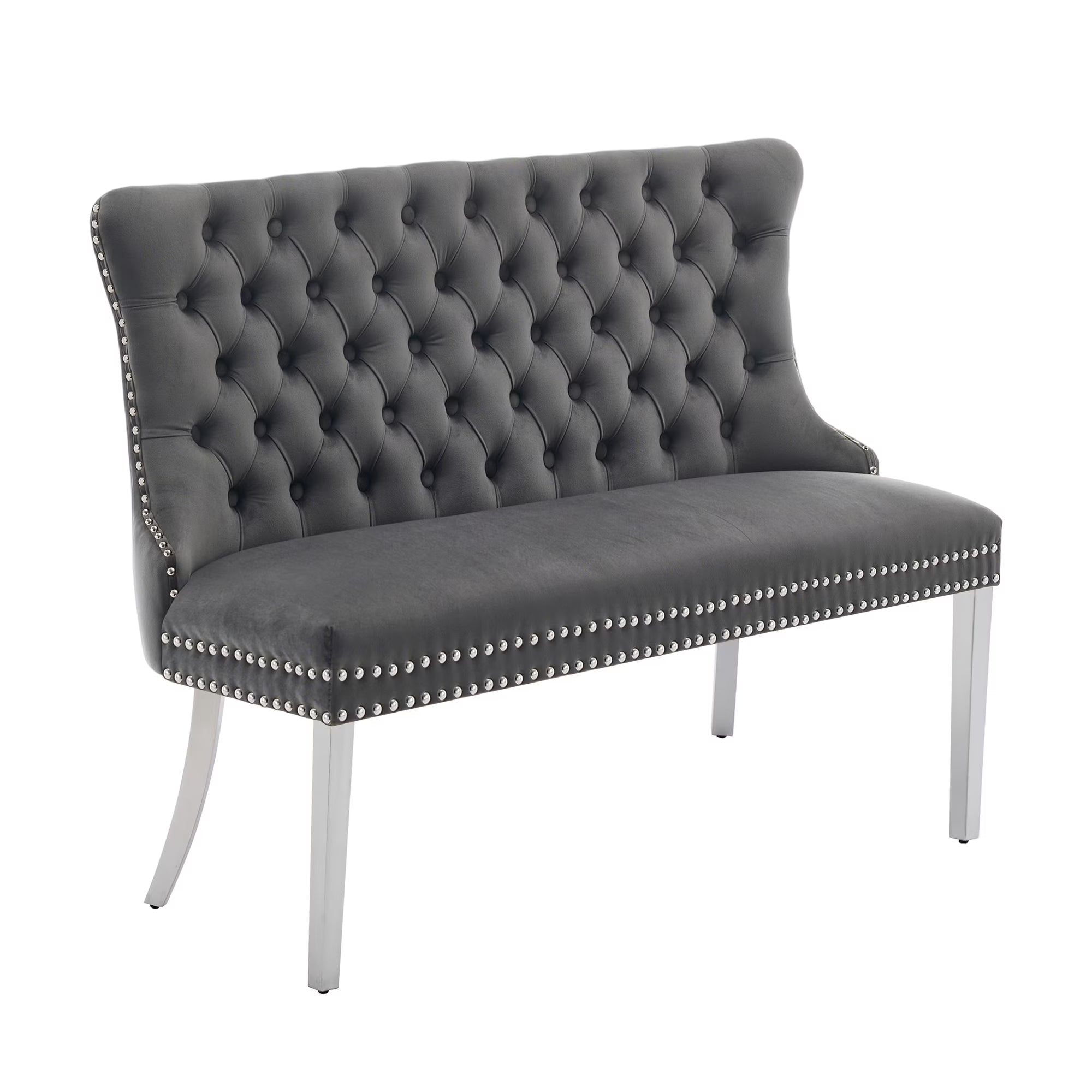 Enhance your dining space with the HUTWIFE 45.6 inch Velvet Dining Bench, a stylish two-seat loveseat featuring luxurious velvet upholstery and comfortable foam filler. This upholstered wingback bench showcases exquisite hand-tufting craftsmanship with 47 handmade buttons and folded edge detailing on the back, complemented by elegant nailhead trim. Its Mid-Century Modern design is elevated by durable gold-plated stainless steel legs, offering excellent load-bearing capacity up to 300 pounds. Perfect for your dining room, entryway, or kitchen, this bench provides a soft, skin-friendly seating experience for family meals and gatherings.