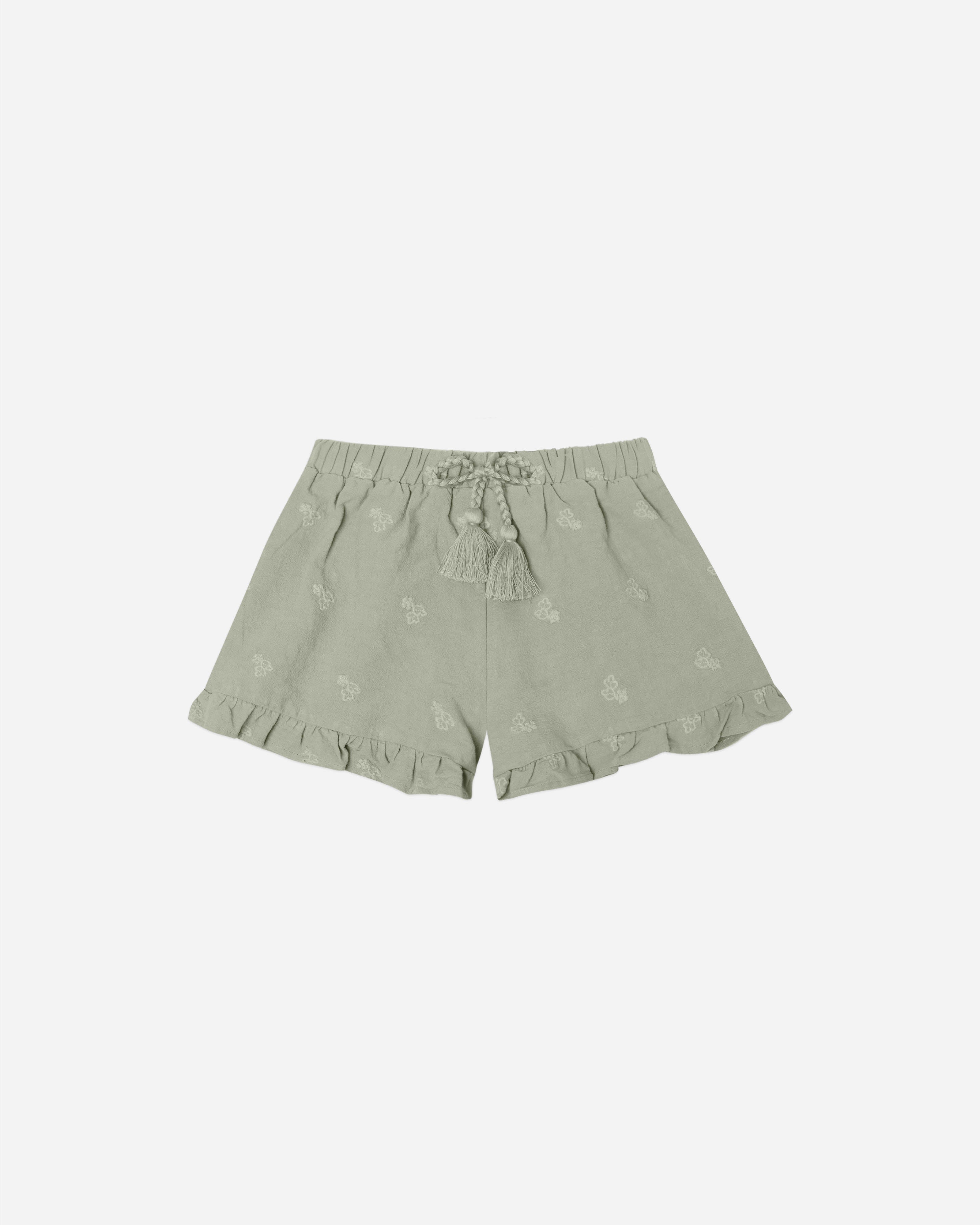 These ruffle shorts feature an elastic waistband with decorative rope and tassel tacked at the front.