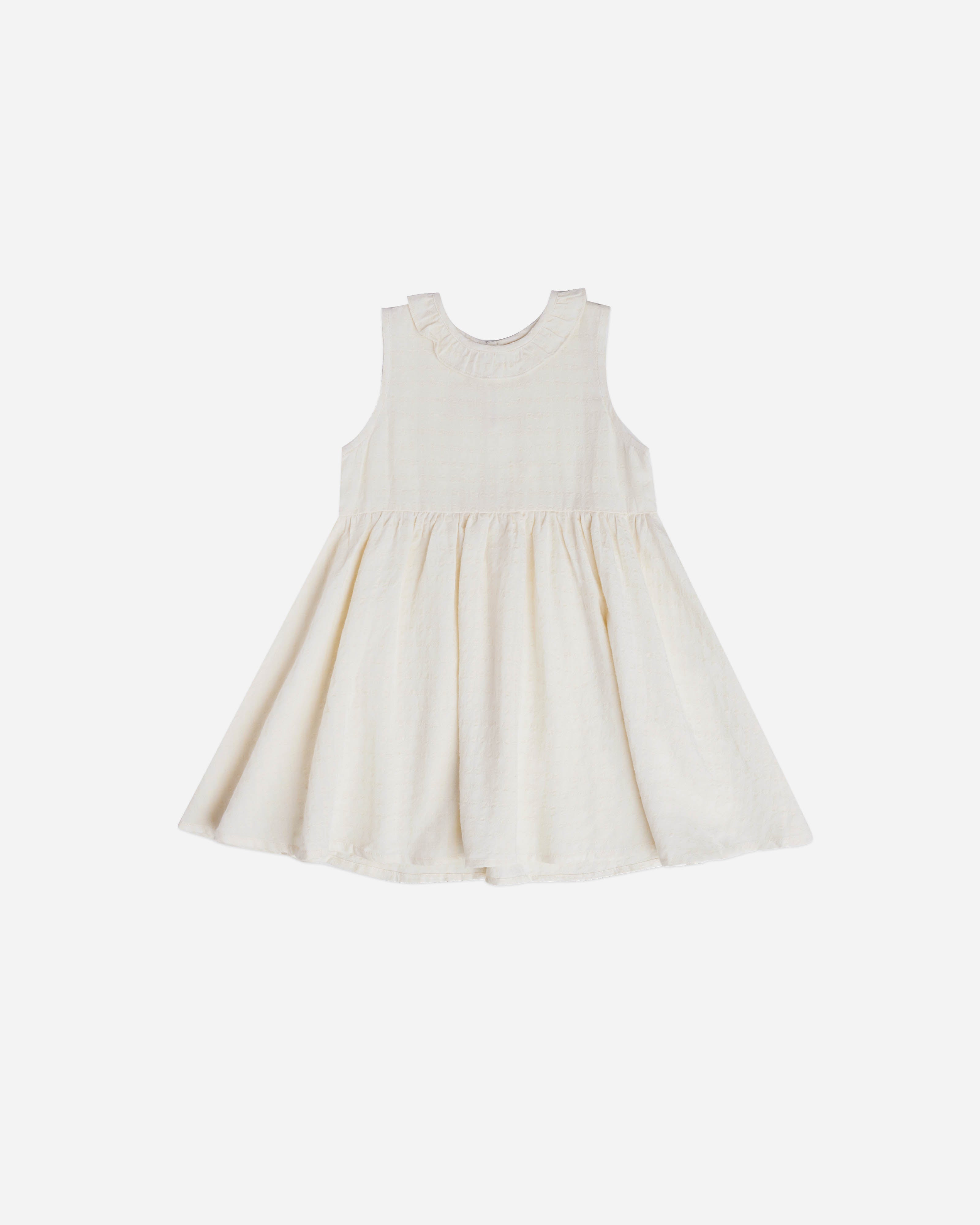 This sleeveless mini dress features a ruffle neck detail and a keyhole on the back.