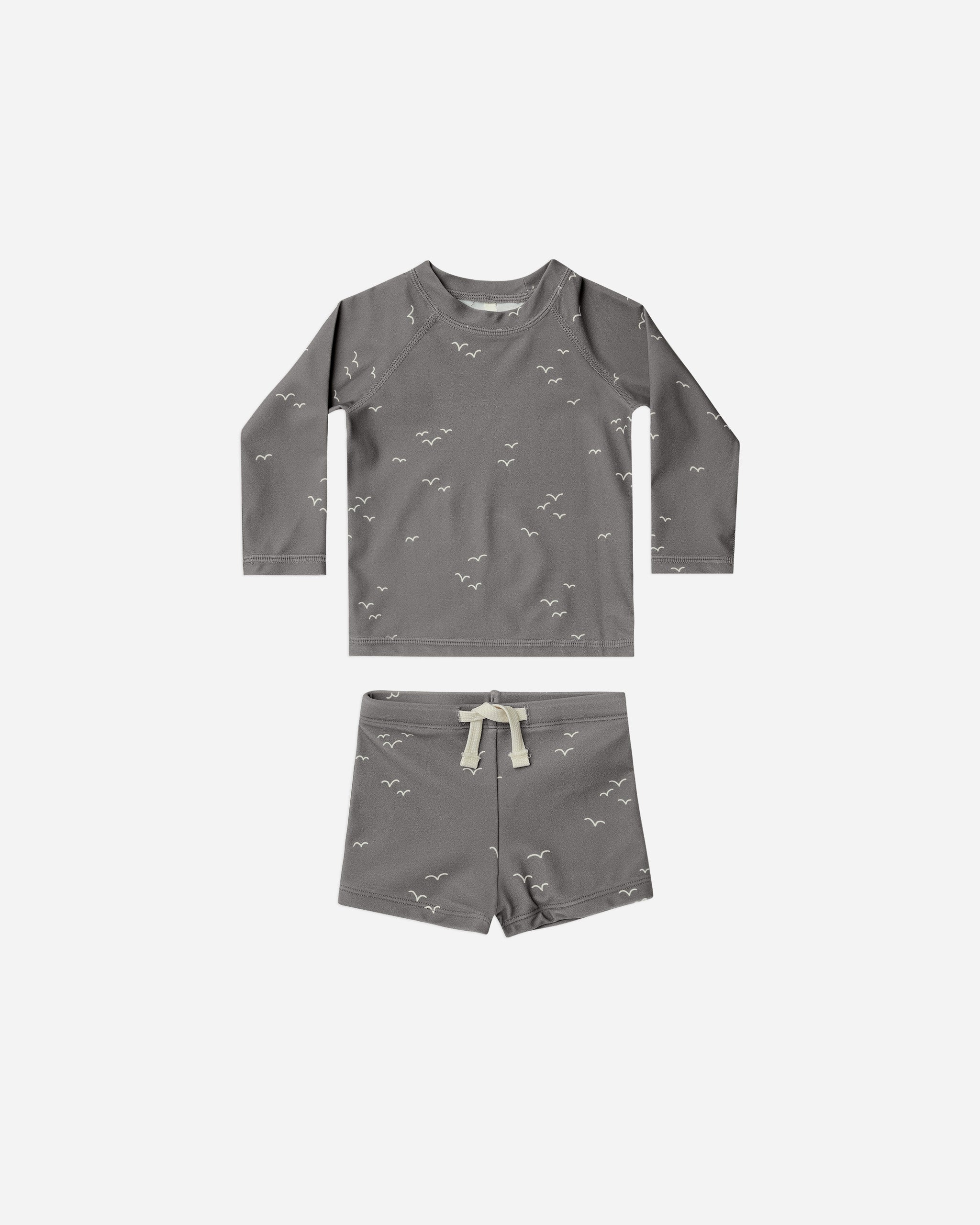 This two-piece rashguard set will have your little one protected from the sun in style. Featuring a long sleeve rashguard top and coordinating swim short bottoms with elastic waistband and adjustable drawstring.