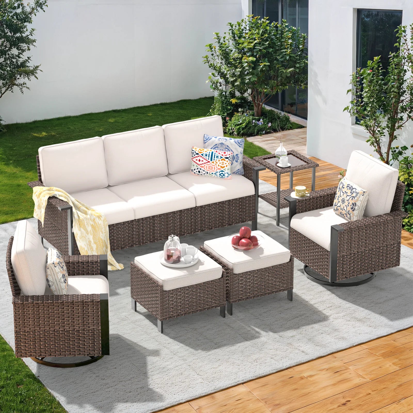 - Versatile 6-Piece Set: Includes a 3-seater sofa, 2 swivel rocking chairs, 2 ottomans and side table, providing ample seating and flexible arrangements for any outdoor space.